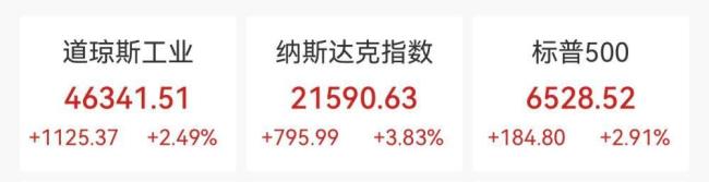 美股周二集体大幅收高,三大指数均创下自去年5月以来的最大单日涨幅。道琼斯工业平均指数涨1125.37点,涨幅2.49%,收于46341.51点。纳指涨795.99点,涨幅3.83%,收于21590.63点